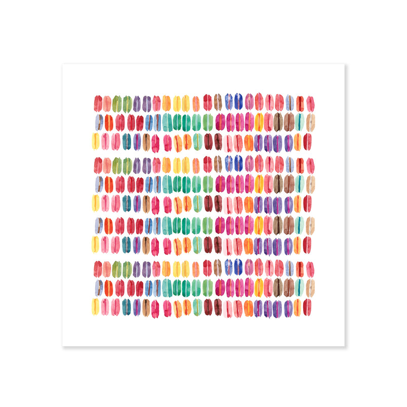 A fine art print illustrating abstract vertical stripes of various lengths in yellow orange green blue pink and purple hues in watercolor on a soft white background